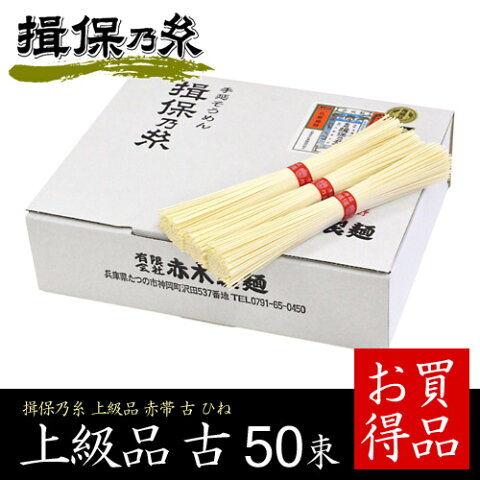 ●箱サイズ/20.5×26×7cm(ボール箱入り)●商品内容/播州手延べそうめん 揖保の糸 上級品 赤帯 古 ひね 2.5kg(50g×50束(把))上級品(赤帯):10月末から3月末の間に2昼夜36時間かけてつくる手延素麺の佳品です。