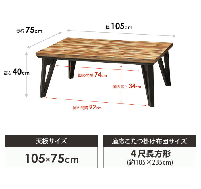 こちらは幅105cmタイプの販売ページです -サイズ- 本体:幅105×奥行75×高さ40cm -材質- 天板:天然木化粧繊維板、ウレタン樹脂塗装(UV加工) 脚部:天然木、塗装 -仕様- 300Wフラットカーボンヒーター 温度調節機能付き手元コントローラー 電源コード長:約3m 天板固定ネジ付き お客様組立品(脚部のみ取付) -お支払い方法について- 代金引換はご利用いただけません -配送- 玄関先お届け -お届けの目安- 3営業日後出荷/4-5日後お届け -配達日時指定- 大型商品のため、配送地域によっては配達時間や配達曜日に制限がある場合がございますので、あらかじめご了承ください。