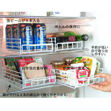 カゴや中身の取り出し楽々! カゴは取っ手付きで高い所でも出し入れ簡単!底の両サイドの脚がレールの 役目をして軽く引き出せますので、すばやく出し入れができて省エネにも。