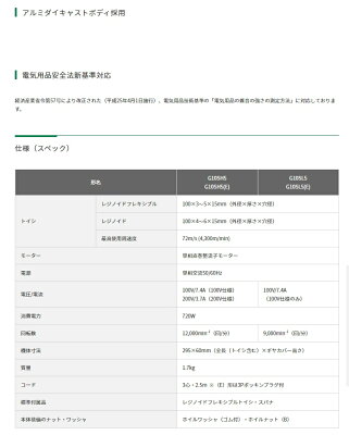 仕様●無負荷回転数(min[[の−1乗]]):12000●砥石径(mm):100●消費電力(W):720●定格電流:7.4A●電源:AC100V●電源コード長さ:2.5m●カーボンブラシ:No.21材質セット内容/付属品●レジノイドフレキシブル砥石(#36)●スパナ注意●日立工機(株)のブランドは、2018年10月「HiKOKI」に変わりました。