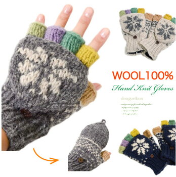 スマホが使えるぬくぬく手編み指なしニットグローブ/雪柄&指先キャンディカラータイプ ウール100% 指先フード付き手袋 f14-11