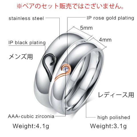 レディース用は上品なピンクゴールドのハートの半分にランクトリプルA(AAA)のキュービックジルコニアをセットした指輪。