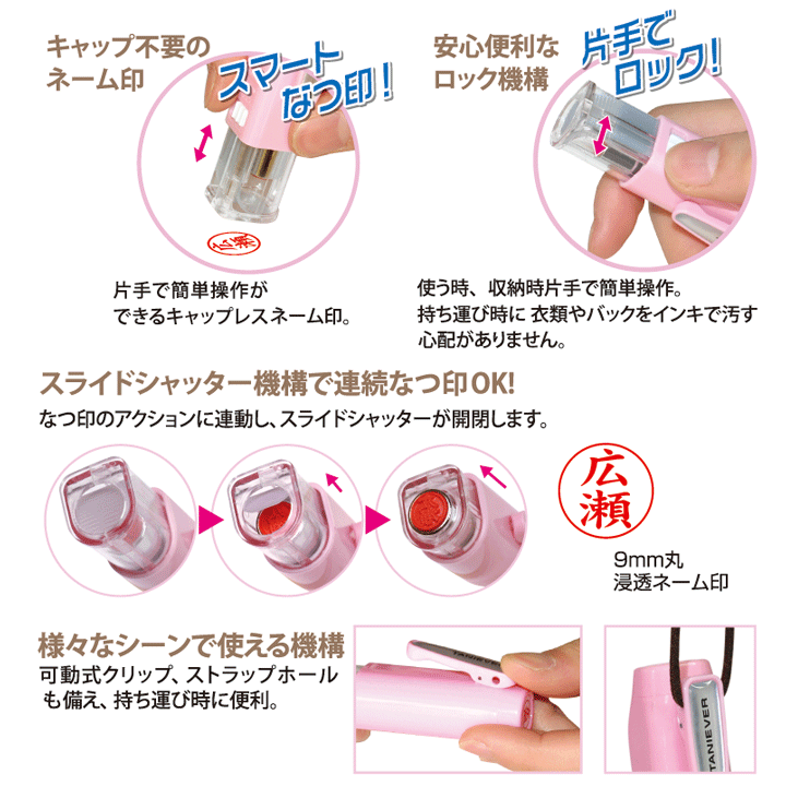 【商品仕様】 ・印面サイズ:9ミリ ・書体:楷書体 ・本体サイズ:約23×25×95ミリ・19g ・本体カラー:ピンク、ブルー、ホワイト ・ インク色:顔料系 朱色 ※補充インキは別売りとなっております 補充インクはタニエバー補充インクをご使用ください。